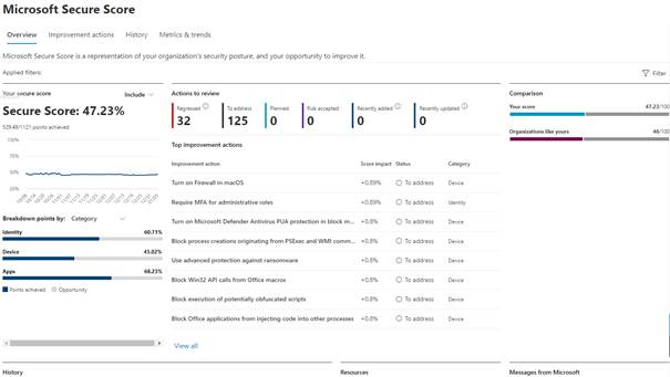 Vous pouvez aussi grâce au secure Score mesurer la posture de sécurité de votre entreprise et ainsi voir les actions recommandées pour l’améliorer.