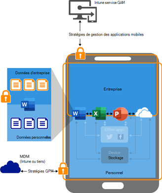 Les stratégies de protection des applications permettent de protéger les données de l’entreprise au niveau même de l’application, sans nécessiter d’inscription de l’appareil au sein du MDM.