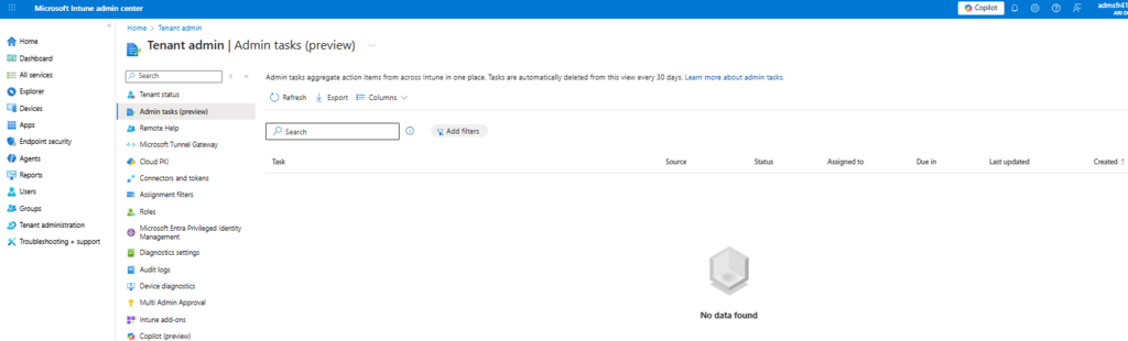 Microsoft a introduit une nouvelle section nommé « Admin Task » en public preview dans le centre d’administration Microsoft Intune. Elle offre une vue unifiée qui regroupe diverses demandes de gestion, telles que les demandes d’élévation liées à EPM, les tâches liées à Defender for Endpoint et les demandes multi admin approval.