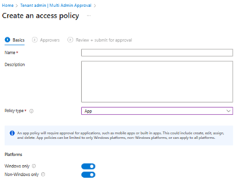 - Pour créer une access policy, vous devez posséder le rôle « Intune Administrator » ou avoir le rôle approprié avec les permissions « Multi Admin Approval ».