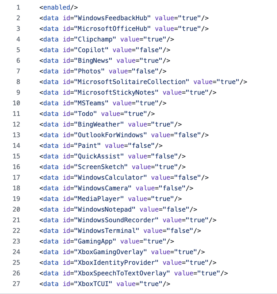Ce XML liste les apps à supprimer (avec un attribut value="true" pour celles à supprimer, value="false" pour celles à conserver)