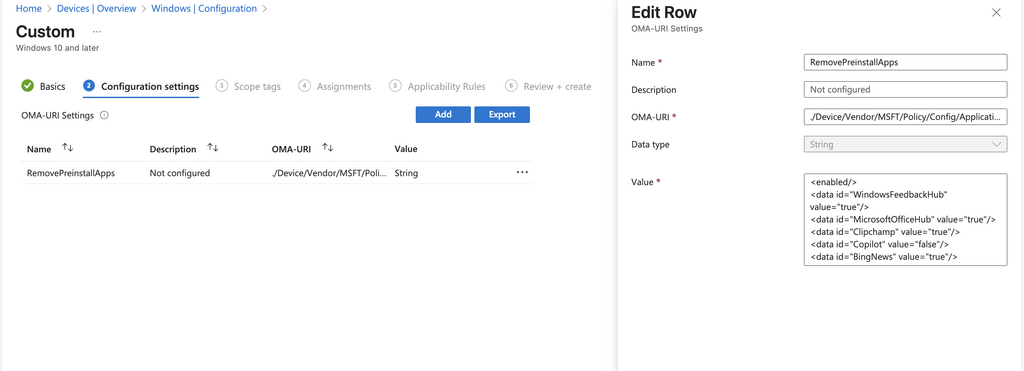- Ajoute l’OMA-URI suivante : ./Device/Vendor/MSFT/Policy/Config/ApplicationManagement/RemoveDefaultMicrosoftStorePackages