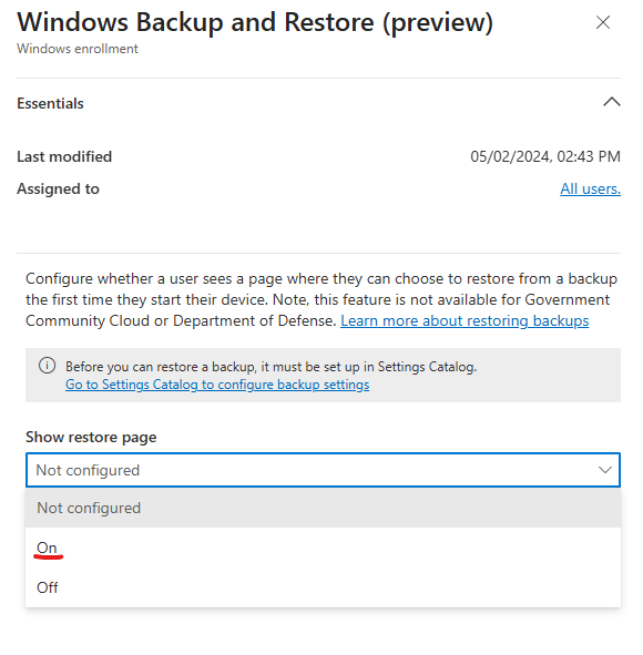 - L’activation de ce paramètre est nécessaire pour activer la restauration des données au niveau de l’OOBE et n’affecte pas les appareils actuellement enrôlé dans Microsoft Intune.