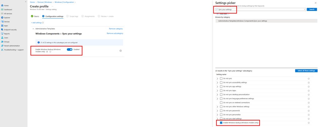 - Pour cela aller dans Intune admin center > Devices > Enrollment > Windows > Enrollment options > Windows Backup and Restore > Basculer sur ON